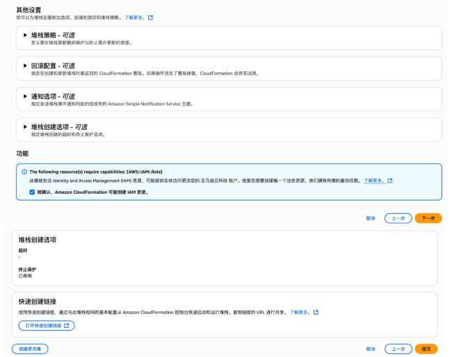 点击下一步,在页面底部确认窗口选择“确认”并点击下一步,再点击提交创建堆栈。