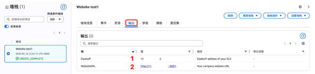 在输出页面可以查看弹性 IP 地址和页面访问链接。