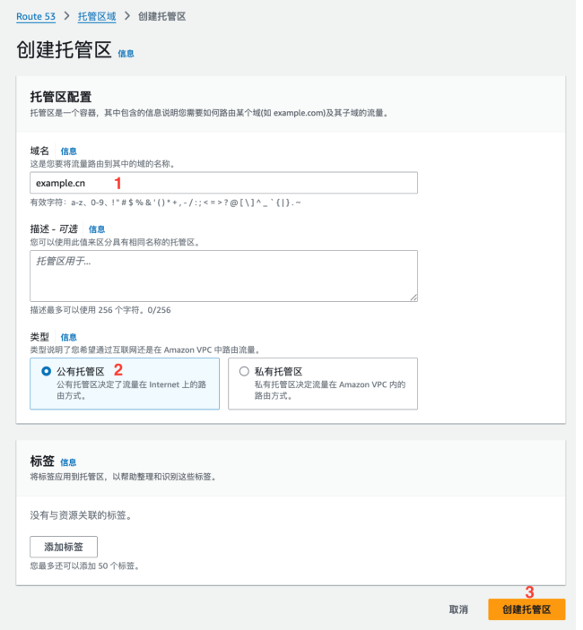 按照下图的顺序,假如您需要托管的域名为 example.cn,则在域名处填写 example.cn。类型选择公有托管,然后点击创建托管区。