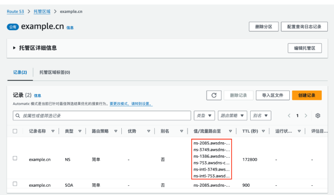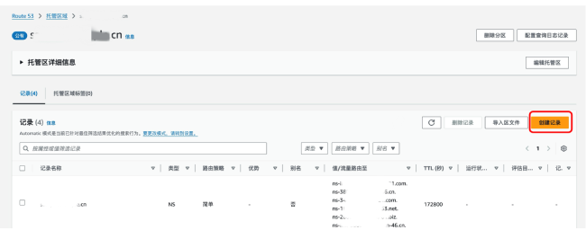 接下来系统会生成该域名的托管区,并进入如下页面,在成功创建托管区域后,记录下上图的 4 条 NS 类型的记录,在域名购买处修改其 NS 服务器为这几个。