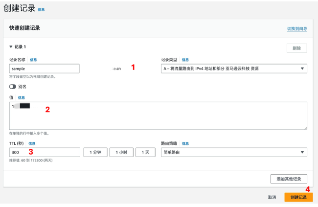 - “记录名称”字段请根据您的需求填写,此处以sample作为示例。(注意:记录名称与您的托管区域域名组合后,形成完整的访问地址。如果您想使用根域名,请将此字段留空。例如,如果您的域名是 example.cn,输入 sample 将创建 http://sample.example.cn 的解析记录。如果您在部署网站的时候指定了端口号8001,您可以通过 http://sample.example.cn:8001 访问您的网站。)