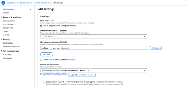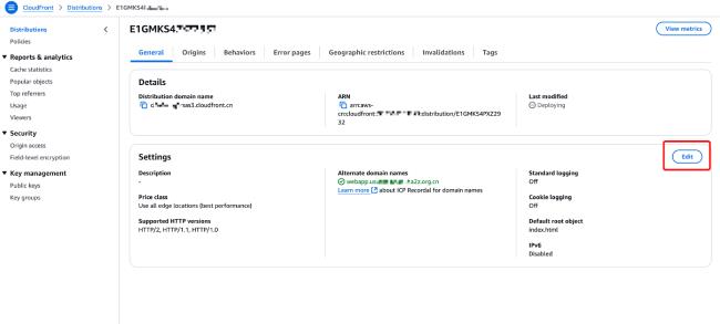 Open the CloudFront console, create or select your existing distribution, and find the option to edit alternate domain names and SSL certificates.