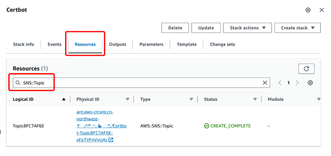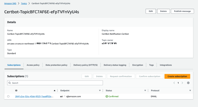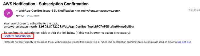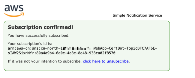 During the project creation process, you will receive an email from in your inbox, inviting you to subscribe to the SNS topic. Please check your inbox while waiting for the stack deployment and click the subscription confirmation link as soon as possible to receive SNS notifications in a timely manner, otherwise you may miss information about the first certificate issuance.