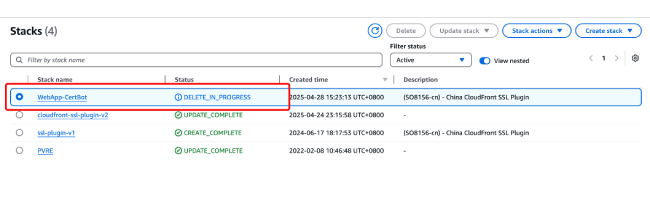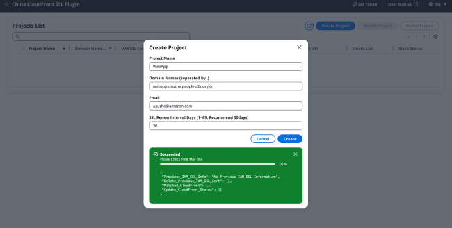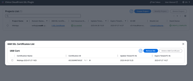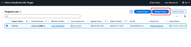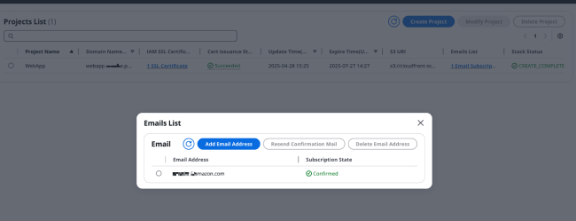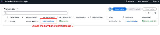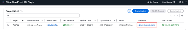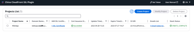 After completing the subscription, you can return to the certificate management page to check the project creation progress. You can also view the stack status in the CloudFormation console. When the certificate management page displays "Succeeded," or when the <project name>-CertBot stack status in the CloudFormation console shows CREATE_COMPLETE, it indicates that the project has been created successfully.