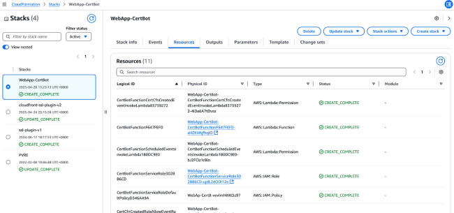 After clicking "Create Project," the certificate management platform will create a stack dedicated to this project in your account. Resources created in the stack include Lambda functions for issuing/renewing SSL certificates, EventBridge rules, SNS topics for sending certificate issuance status, and more.