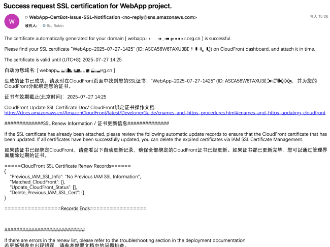 If you subscribed to the notification service in Step 3 in a timely manner, shortly after the project is successfully created, you will receive an email from <no-reply@sns.amazonaws.com>. The email will display the certificate issuance status and CloudFront update information. If the certificate is successfully issued, the email will show the certificate name and ID. The certificate name consists of the stack name and the SSL certificate expiration time. For example: certificate name WebApp-2025-04-28-1324 corresponds to a certificate expiration time of April 28, 2025, at 1:24 PM.