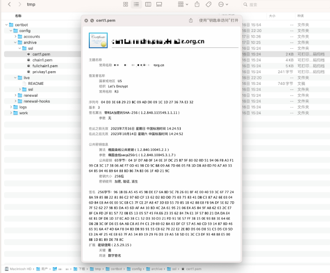 Access the path /tmp/certbot/config/archive/ssl in the extracted folder to see the generated SSL certificate, certificate private key, certificate chain, and other files.