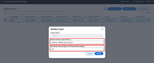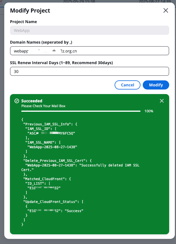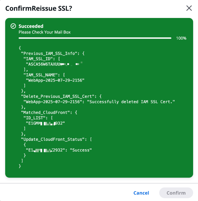 If in the Update_CloudFront_Status field, content other than "Success" appears after a CloudFront distribution ID (such as "Failed"/{"Update_Dist_Error": "..."}/{"Get_Dist_Error": "..."}), it indicates that the backend encountered an error when updating the certificate for that distribution.