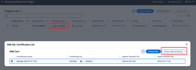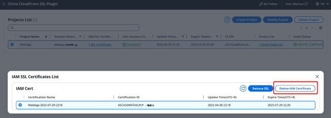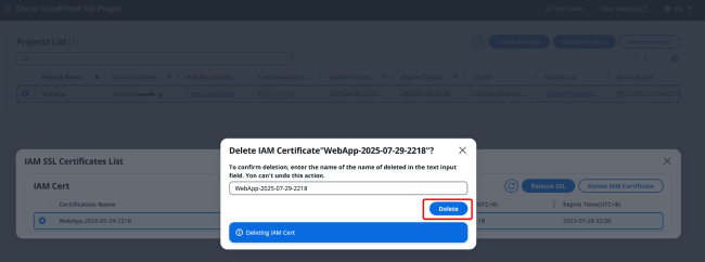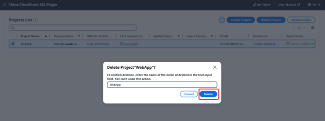 Before deleting a project, you need to check whether the certificates in the project are associated with CloudFront distributions. If associations exist, you must first remove these associations. After ensuring all associations are removed, manually delete all certificates from the certificate list; otherwise, the project cannot be deleted.