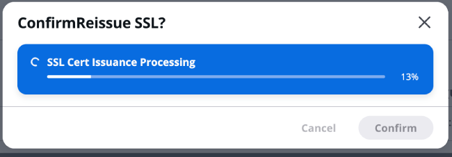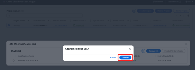 In the certificate list, click [Reissue] in the upper right corner and click [Confirm] in the pop-up window.