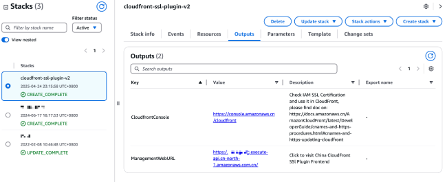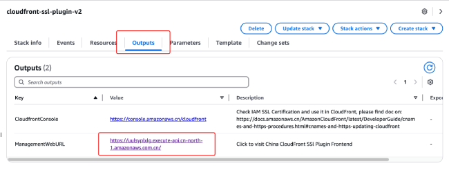 Open allIn the stack "Output" tab, find the ManagementWebURL, click on the URL link to enter the certificate management page.