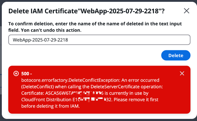 Note: Before deleting a certificate, please ensure that no CloudFront distribution is bound to the certificate. Otherwise, the deletion operation will result in a 500 error as shown in the image below, and the deletion cannot proceed.