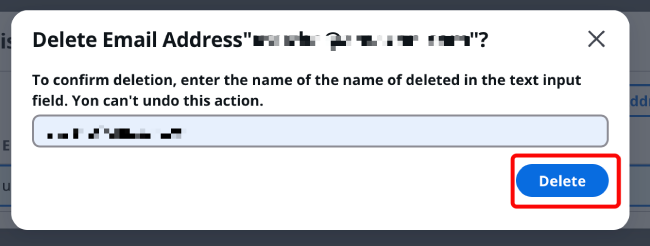 Enter the Email address you want to delete in the dialog box for confirmation, then click [Delete] in the bottom right corner.