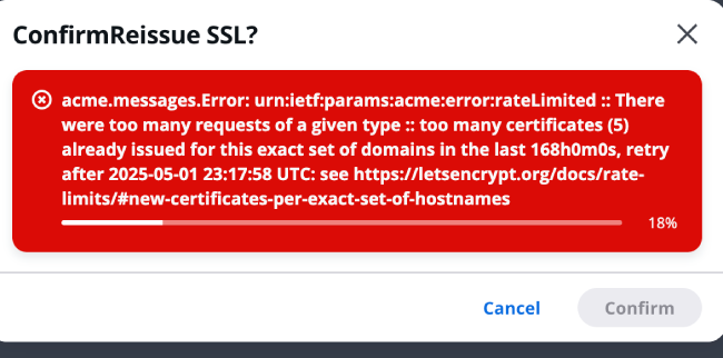 Error message: "acme.messages.Error: urn:ietf:params:acme:error:rateLimited :: There were too many requests of a given type ::"