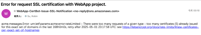 This indicates that you have applied for certificates for your domain 5 times within a short period (exceeding Let's Encrypt's limit of issuing only 5 certificates per week for repeated domains), therefore the certificate issuance request failed.