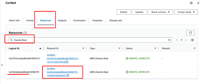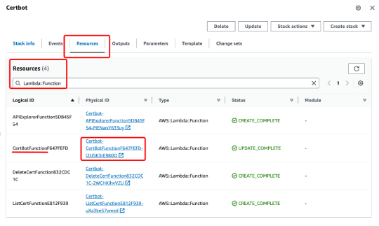 1. In the resources tab of the stack, search for "Lambda::Function" and select the Function that begins with CertBot.