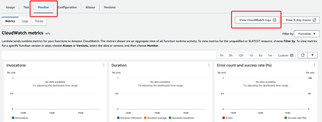 2. After clicking into the function, go to the monitoring tab at the bottom of the page, then click on "View CloudWatch Logs" on the right side.