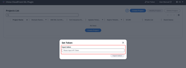 ManagementWebURL: Access the certificate management frontend page, where you'll see the frontend page with no project data and a dialog box for entering the key.