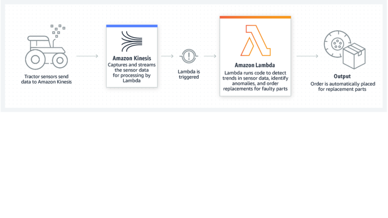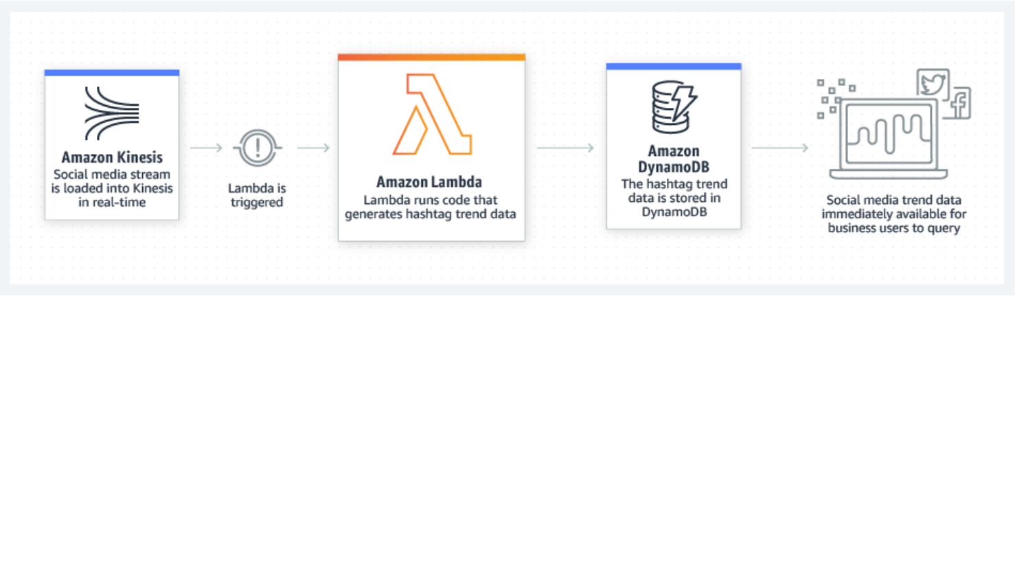 You can use Amazon Lambda and Amazon Kinesis to process real-time streaming data for application activity tracking, transaction order processing, click stream analysis, data cleansing, metrics generation, log filtering, indexing, social media analysis, and IoT device data telemetry and metering.