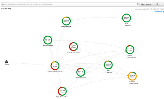 Open allAmazon X-Ray creates a map of services used by your application with trace data that you can use to drill into specific services or issues. This provides a view of connections between services in your application and aggregated data for each service, including average latency and failure rates. You can create dependency trees, perform cross-availability zone or region call detections, and more.