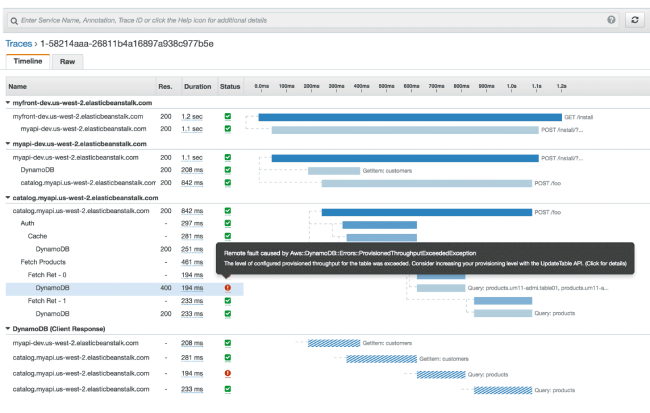 Open allAmazon X-Ray provides an end-to-end, cross-service view of requests made to your application. It gives you an application-centric view of requests flowing through your application by aggregating the data gathered from individual services in your application into a single unit called a trace. You can use this trace to follow the path of an individual request as it passes through each service or tier in your application so that you can pinpoint where issues are occurring.
