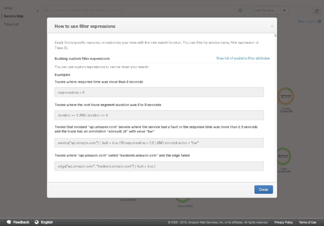 Open allAmazon X-Ray lets you add annotations to data emitted from specific components or services in your application. You can use this to append business-specific metadata that help you better diagnose issues. You can also view and filter data for traces by properties such as annotation value, average latencies, HTTP response status, timestamp, database table used, and more.
