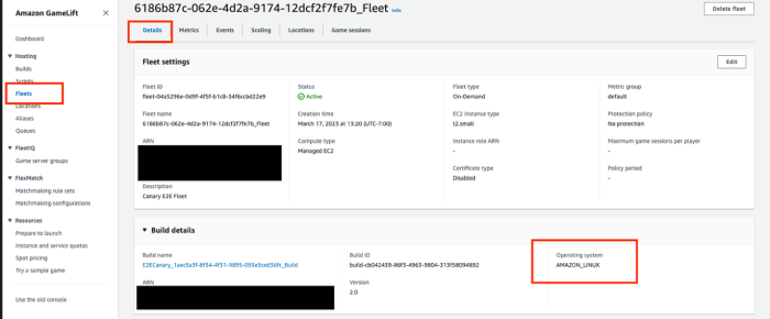 您可以登录 Amazon GameLift 控制台,在实例集的“版本详细信息”部分下查找“操作系统”属性,如下所示。或者,您可以调用 DescribeFleetAttributes API,以检索在响应的“操作系统”参数中找到的操作系统值。有关详细信息,请查看 API 参考页面。如果您在控制台视图或 API 响应中看到“AMAZON_LINUX”,则表示您目前正在实例集中使用 AL1,需要升级到 AL2。