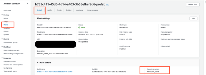 您可以登录 Amazon GameLift 控制台,在实例集的“版本详细信息”部分下查找“操作系统”字段的值,如下所示。或者,您可以调用 DescribeFleetAttributes API,以检索在响应的“操作系统”参数中找到的操作系统值。有关详细信息,请查看 API 参考页面。如果您在控制台或 API 响应中看到“WINDOWS_2012”,则表示您目前正在实例集中使用 Windows Server 2012,需要升级到 Windows Server 2016。