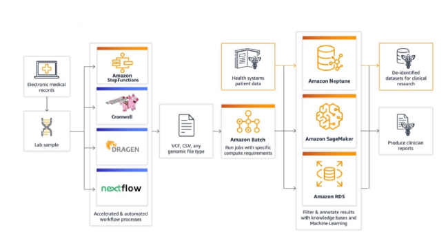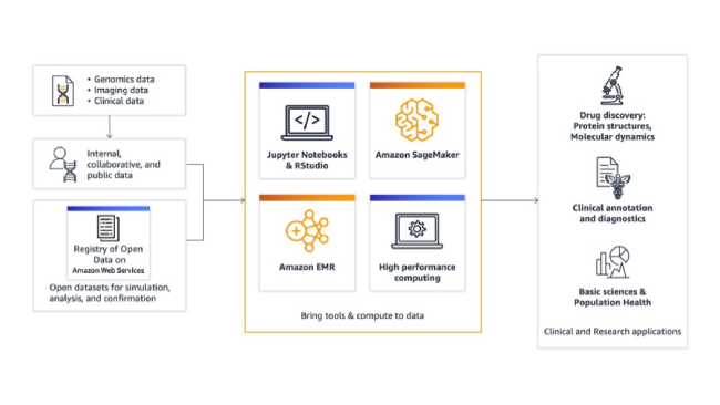 分析功能需要用到集成式多模态数据集和知识库、密集计算能力、大数据分析和大规模机器学习,而这些历来需要数周或数月时间,从而延迟提供洞察的时间。亚马逊云科技利用机器学习和高性能计算,加速大规模基因组学数据分析。借助亚马逊云科技,研究人员可以大规模地利用更高的计算效率、可重现的数据处理、用于引入多模式数据集的数据集成功能,以及用于临床注释的公共数据,并且这一切均是在符合合规性的环境中进行的。