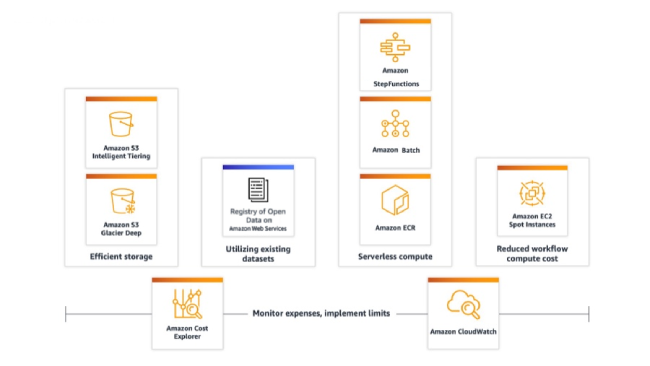 研究人员用到的基因组数据集很庞大,这些数据集需要大规模的存储选项和强大的计算处理能力,而这可能会导致成本过高。亚马逊云科技在整个数据生命周期(从存储到解释)中,都为基因组学研究人员提供了节省成本的机会。借助亚马逊云科技基础设施和数据服务,企业或组织得以节省了时间、金钱,并将更多的资源投入到科研领域。
